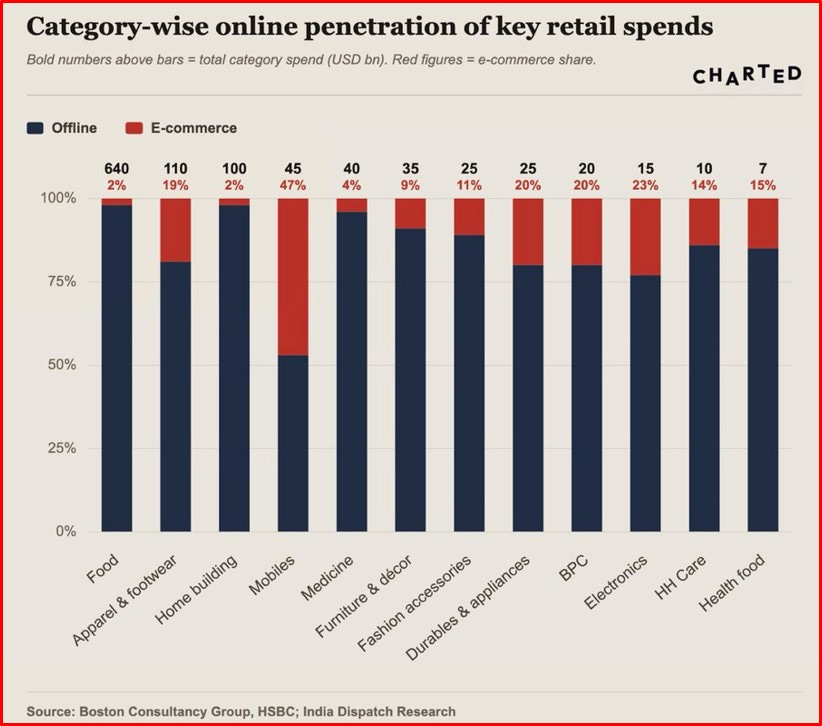The categories D2C has obsessed over, BPC at 23% online penetration, fashion accessories at 11%, and electronics at 14%, are Indiaās most competitive and also its smallest by total retail spend. Food commands $640bn with 2% e-commerce share; home building holds $100bn at the same 2%.