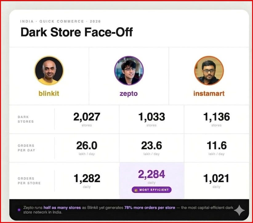 Zepto runs 1,033 dark stores against Blinkitās 2,027, and the market share chart marks it the clear second player, but 2,284 orders per store per day against Blinkitās 1,282 tells a completely different story about which business model is defensible. Blinkit built its lead through store count; Zepto built its advantage through yield per store. (The numbers are still being debated by the competition) The gap is 78%. In quick commerce, per-store productivity is the number that predicts who survives the next serious capital correction.