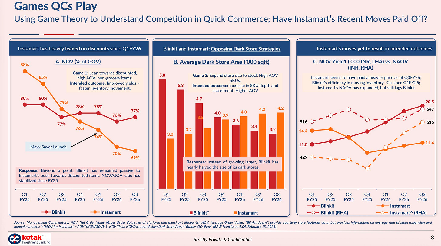 Blinkit watched Instamart run two conscious strategic bets: leaning into discounts since Q1FY26 and expanding dark stores to chase higher-value SKUs, moves Blinkit largely ignored, while shrinking its own stores and keeping margins stable. The result: Instamartās inventory yield still sits at barely half Blinkitās, and order value still lags. Blinkitās move was not to move.