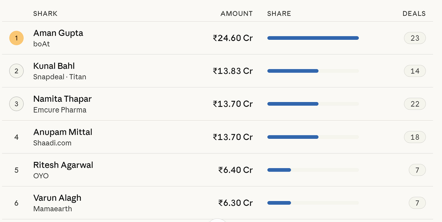 Shark Tank India Season 5 just wrapped with a campus special, and the numbers are in. Of 152 pitches, 73 startups secured deals, with total commitments of Rs 94.88 crore. Aman Gupta led the pack -23 investments, Rs 24.6 crore committed, living up to his reputation as the tank's most trigger-happy shark. Namita Thapar and Anupam Mittal tied at Rs 13.7 crore each, while Kunal Bahl punched in Rs 13.83 crore across 14 deals.
