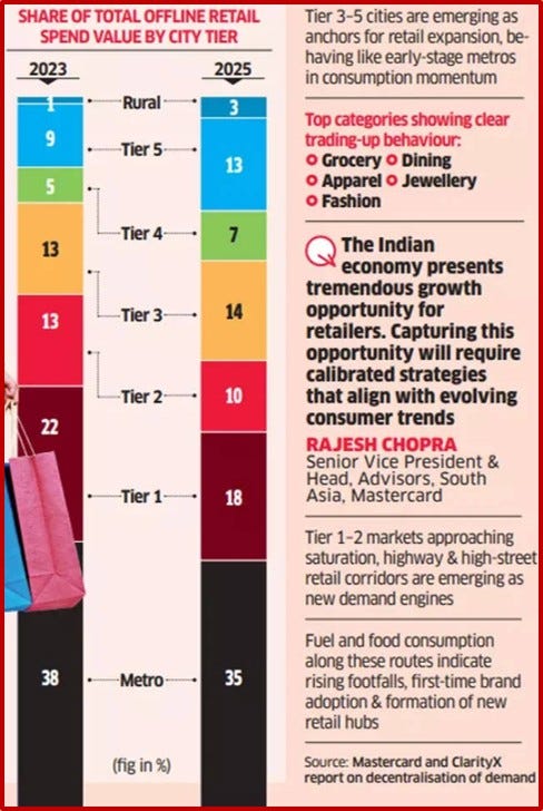 Tier 3–5 markets, once treated as distribution afterthoughts, now look like India’s fastest retail engines, growing nearly twice as fast as metros in 2025 . Demand is decentralising. With populations as low as 5,000 fuelling premiumisation across Fuel, Food and Fashion, highways and high streets are becoming full-fledged consumption corridors. The mall is no longer the default growth story.